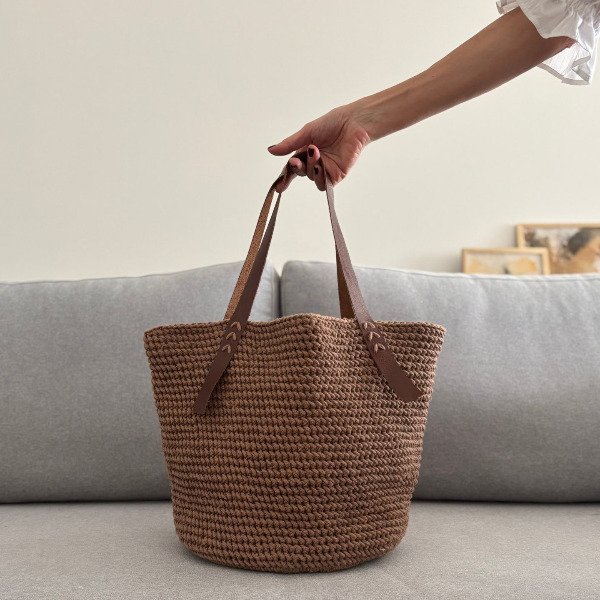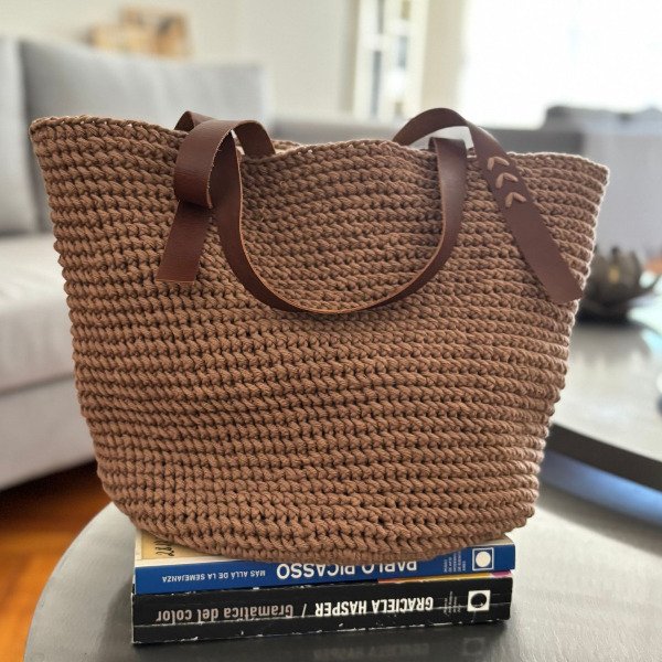 Tejido a mano con hilo 100% algodón, las asas son en cuero color chocolate, el interior es forrado tiene un bolsillo y broche imán. Medias aproximadas: 48 cm de ancho por 33 cm de alto (Al ser un producto artesanal puede variar en 1 o 2 cm)